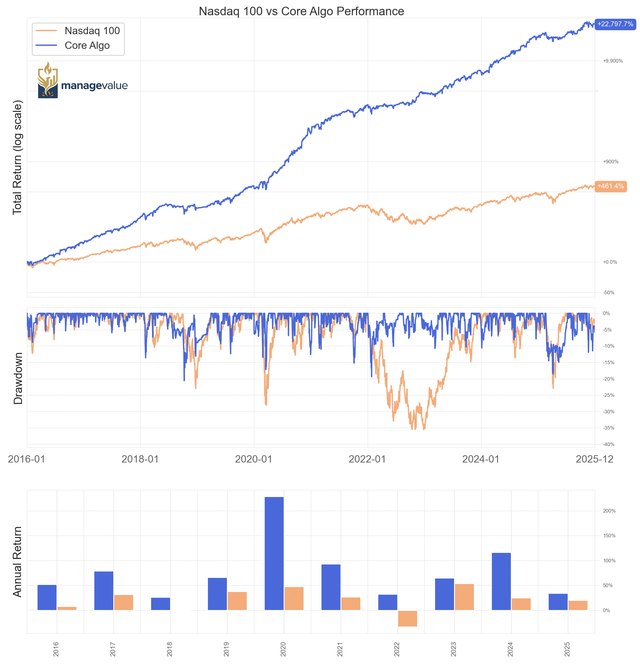 It trades Nasdaq 100 stocks exclusively. Historical testing spans the Nasdaq 100 back to 1993 and the S&P 500 back to 1957 — stress-tested across the 1987 crash, dot-com collapse, 2008 crisis, COVID-19, and multiple stagflation and recessionary periods.